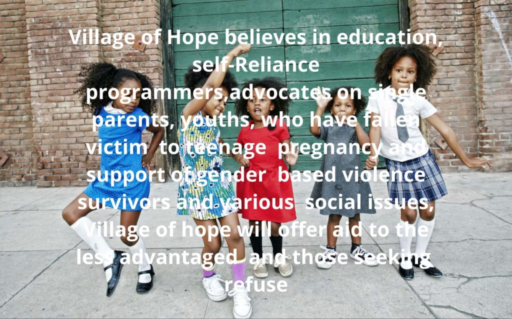 Village of Hope believes that all individuals are equal as human beings and virtue of the inherent dignity of the person, therefore no one should suffer discrimination on the basis of  Race, Colour, Age, Language, Social Geographical, and status.